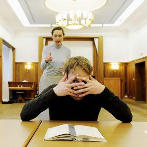 Zwischen der Vernissage im Deutschen Bundestag und der Ursendung+x von Gertraudens Kinder liegt die Uraufführung der Häutungen Franz Fühmanns. Für die Premiere gibt es kaum noch Karten, aber für die Aufführungen am 1./5./6. Dezember können gut Plätze reserviert werden; der Eintritt im Berlin-Saal in Berlin-Mitte ist frei. – Eine Stunde vor Vorstellungsbeginn bietet die Berliner Zentral- und Landesbibliothek eine Führung durch Fühmanns Arbeitsbibliothek an: BerlinSammlungen@zlb.de – Bereits online ist der erste Teil des Podcasts, nachzuhören auf Soundcloud, Spotify und via RSS-feed: auf den Spuren des Menschen Franz Fühmann. – Das Foto von (c) Lena Obst zeigt Christian Erdt und Laura Mitzkus in Fühmanns Welt.