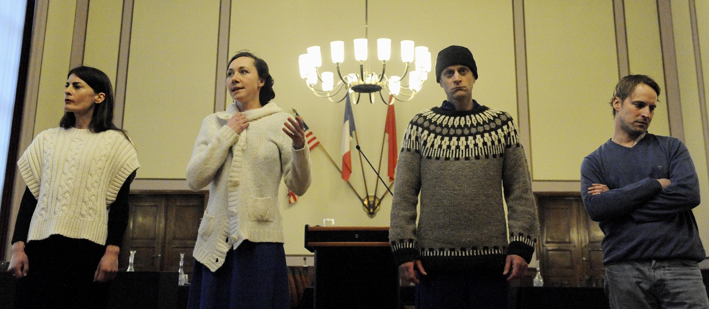 Zu Aufführungen kommt es im März zwar noch nicht, aber in Vajswerks Werkstatt wird fleißig gebosselt. Für #geschichte_schreiben treffen sich die Historiker:innen und Schauspieler:innen (Foto: Stefan Paul-Jacobs und Christian Erdt „für Deutschland“), für Häutungen Franz Fühmanns geht es wöchentlich ins Archiv der Akademie der Künste, Gertraudens Kinder laden wir am 20. März in die heutige Halvorsen Schule und am 11. März fahren wir nach dem Frühlingstreffen – der gleichzeitigen Mitgliederversammlung – nach Herzberg, zum Ort des Geschehens von Platte Macchiato. Darüberhinaus bekamen wir im März eine Einladung nach Leipzig, zum Symposion von Children born of war und eine erneute Förderung der Jugendfassung von Großes Kino DDR. Aber erstmal wird Geschichte geschrieben, mit der Uraufführung am 22. April.